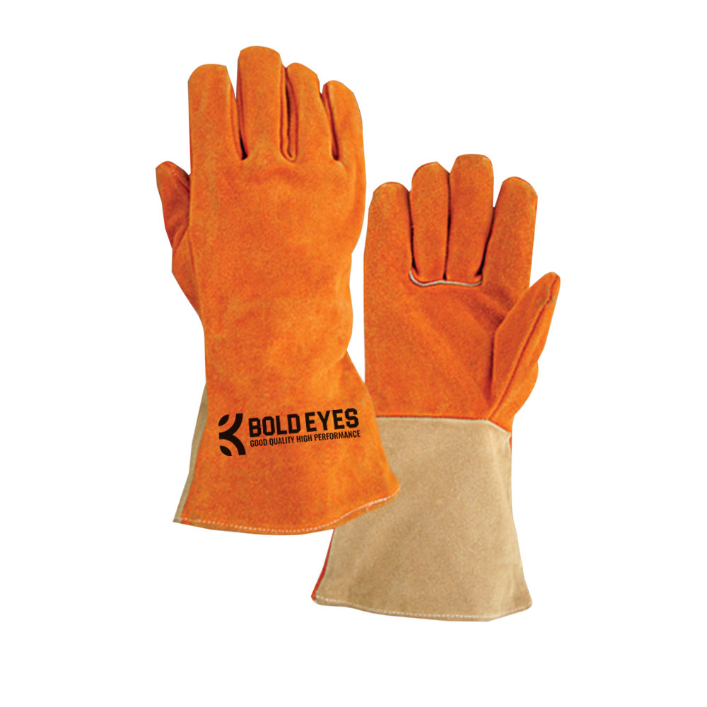 14 inches cowsplit leather gloves, stitched with kevlar thread, with inside fabric lining.